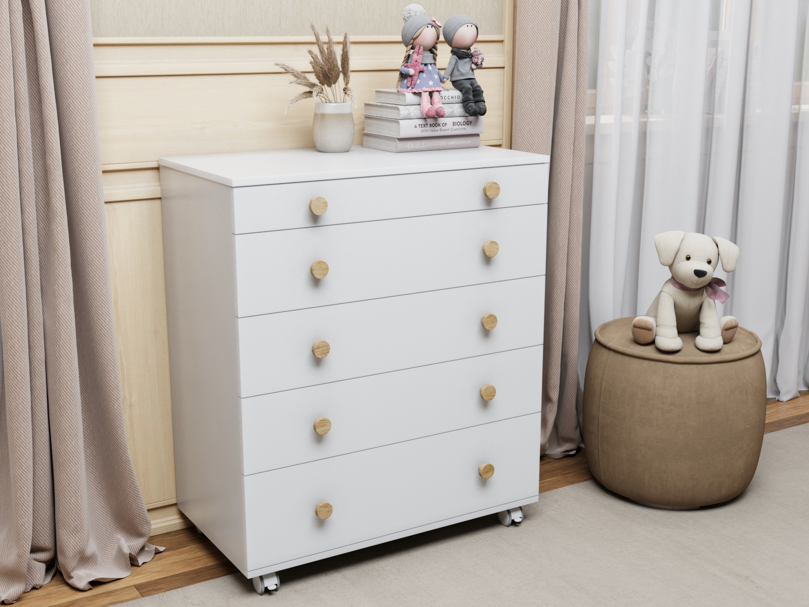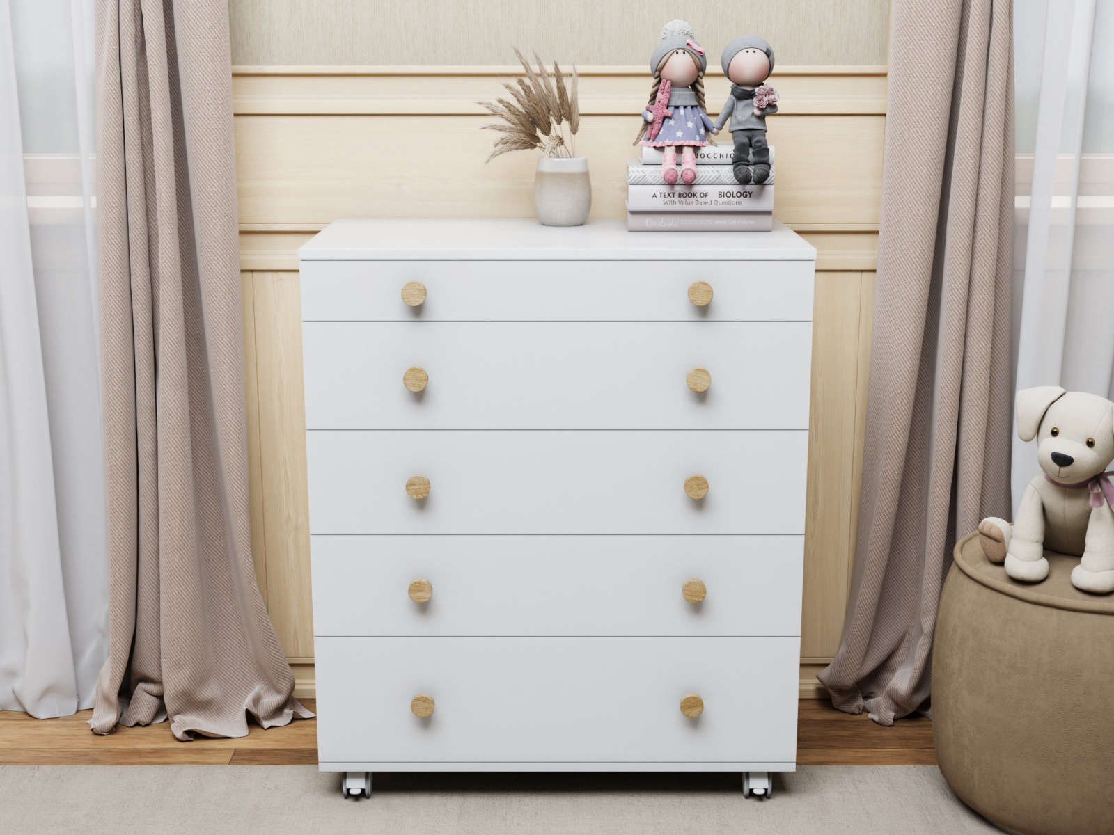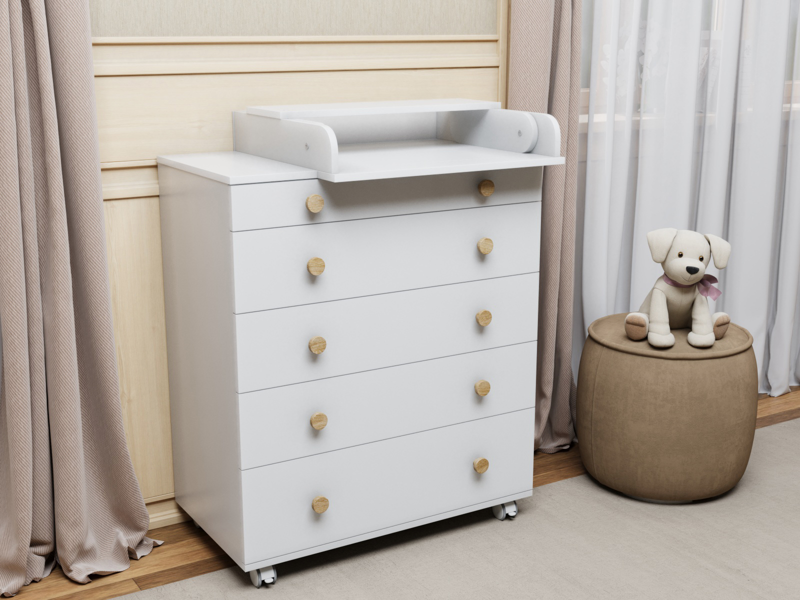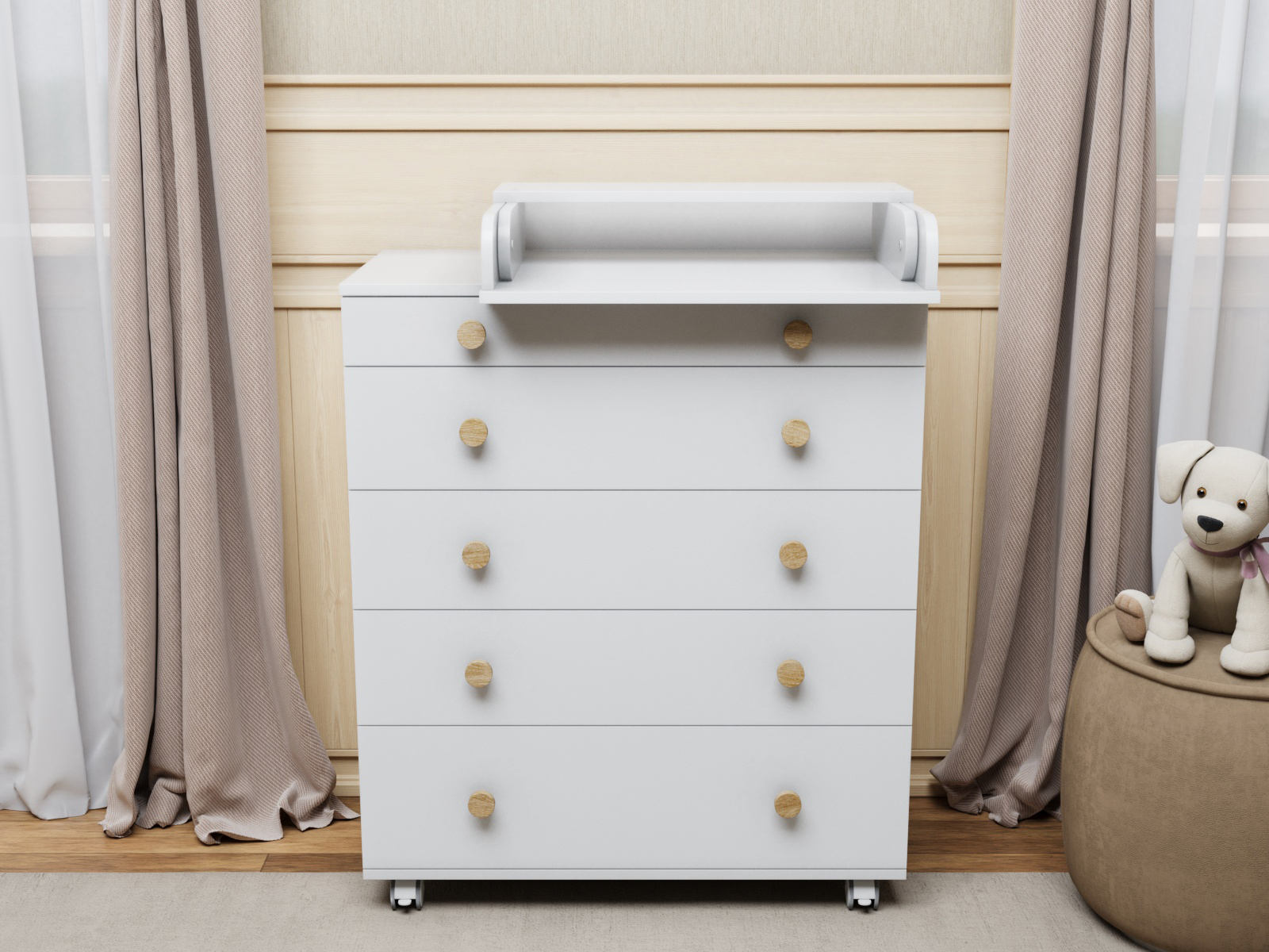 Комод можно использовать с пеленальным столиком или как классический комод для хранения вещей. Пеленальная доска с защитными бортиками на комоде съемная, ее легко можно передвигать в любую сторону комода или полностью убрать когда ребенок подрастет. Использование комода облегчит родителям уход за ребенком во время гигиенических процедур, также поможет в экономии места и организации порядка в детской комнате. Комод устанавливается на 4 поворотных прорезиненных колеса, 2 из которых со стопорами - это дополнительное преимущество, мама при необходимости может перемещать комод по комнате с вещами, что облегчает процесс уборки или перестановки.