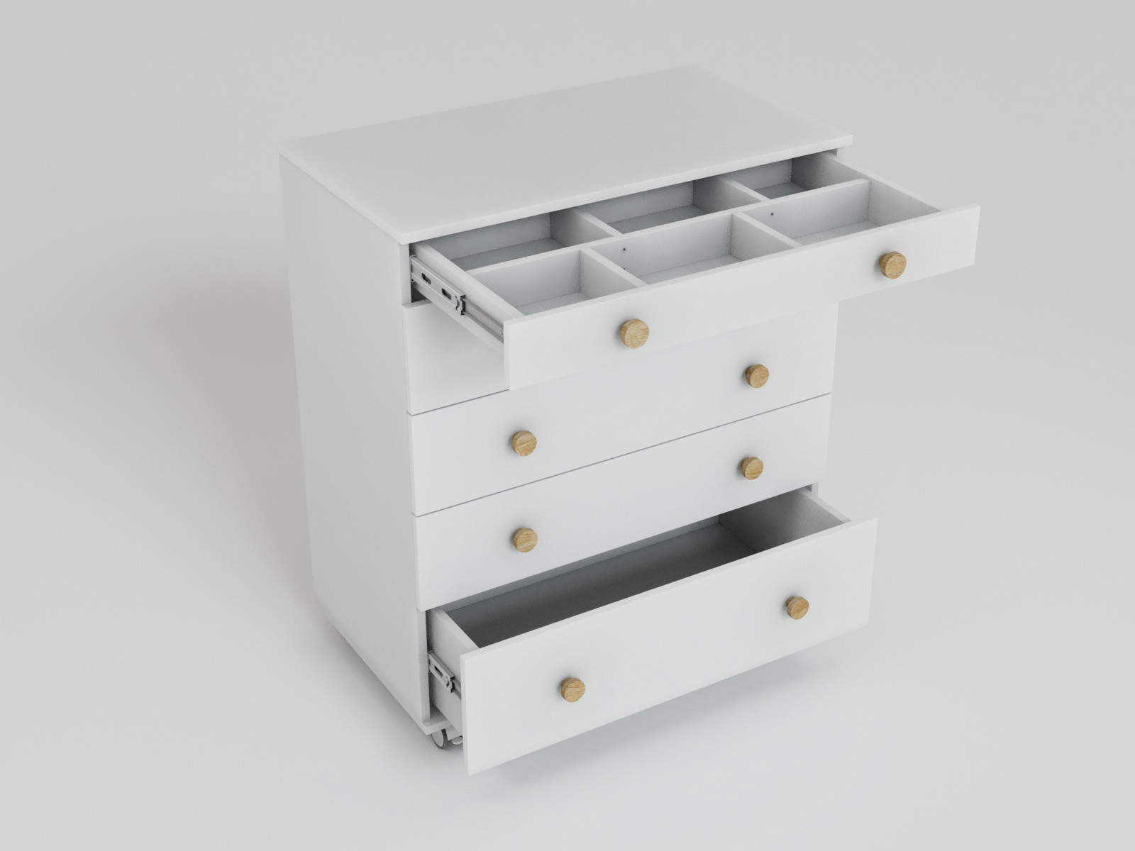 Пять вместительных ящиков с лёгкостью выдвигаются и задвигаются на шарикоподшипниковых направляющих.