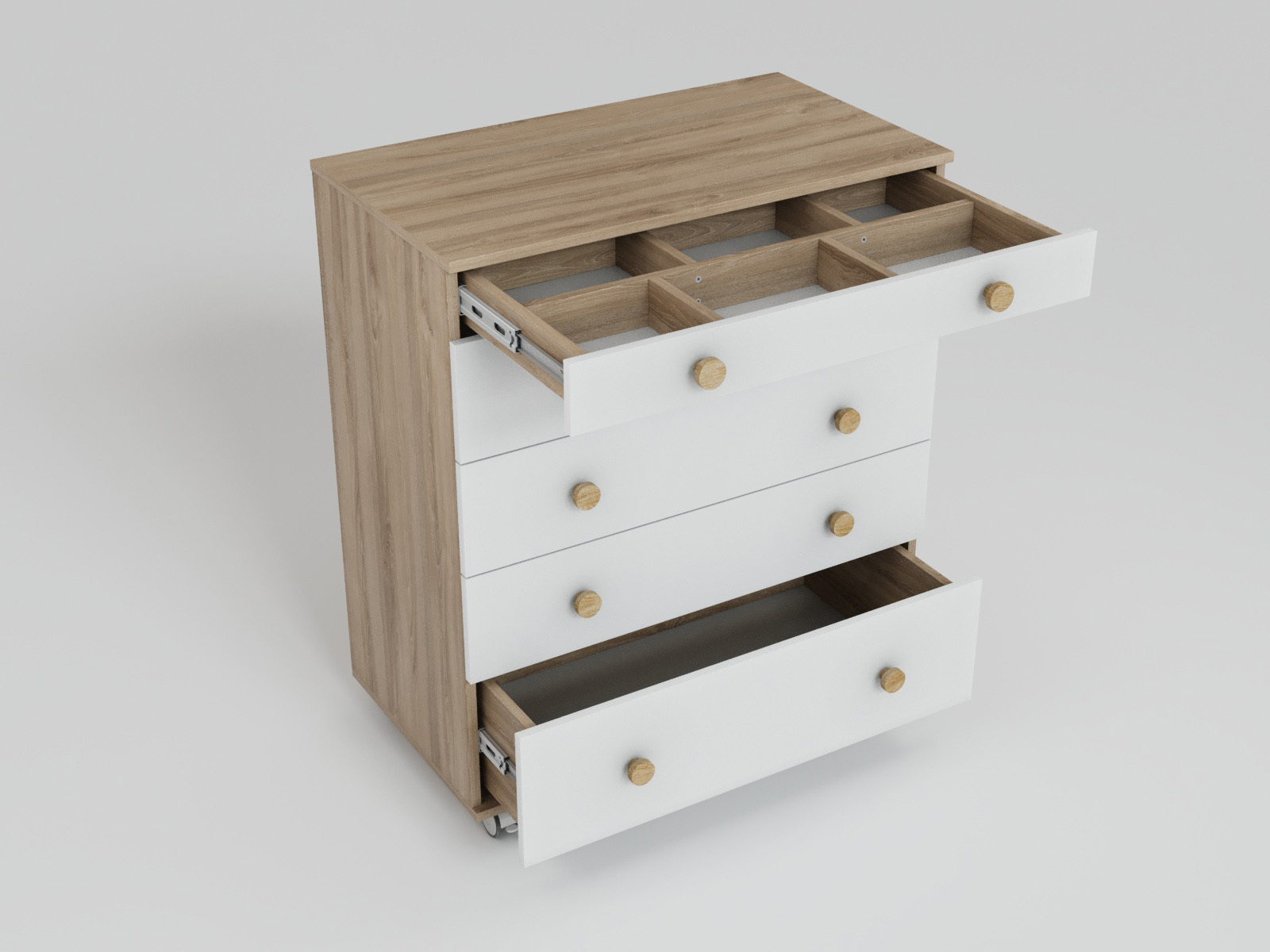 Верхний ящик комода оснащён органайзером для удобства хранения мелочей и детской косметики.